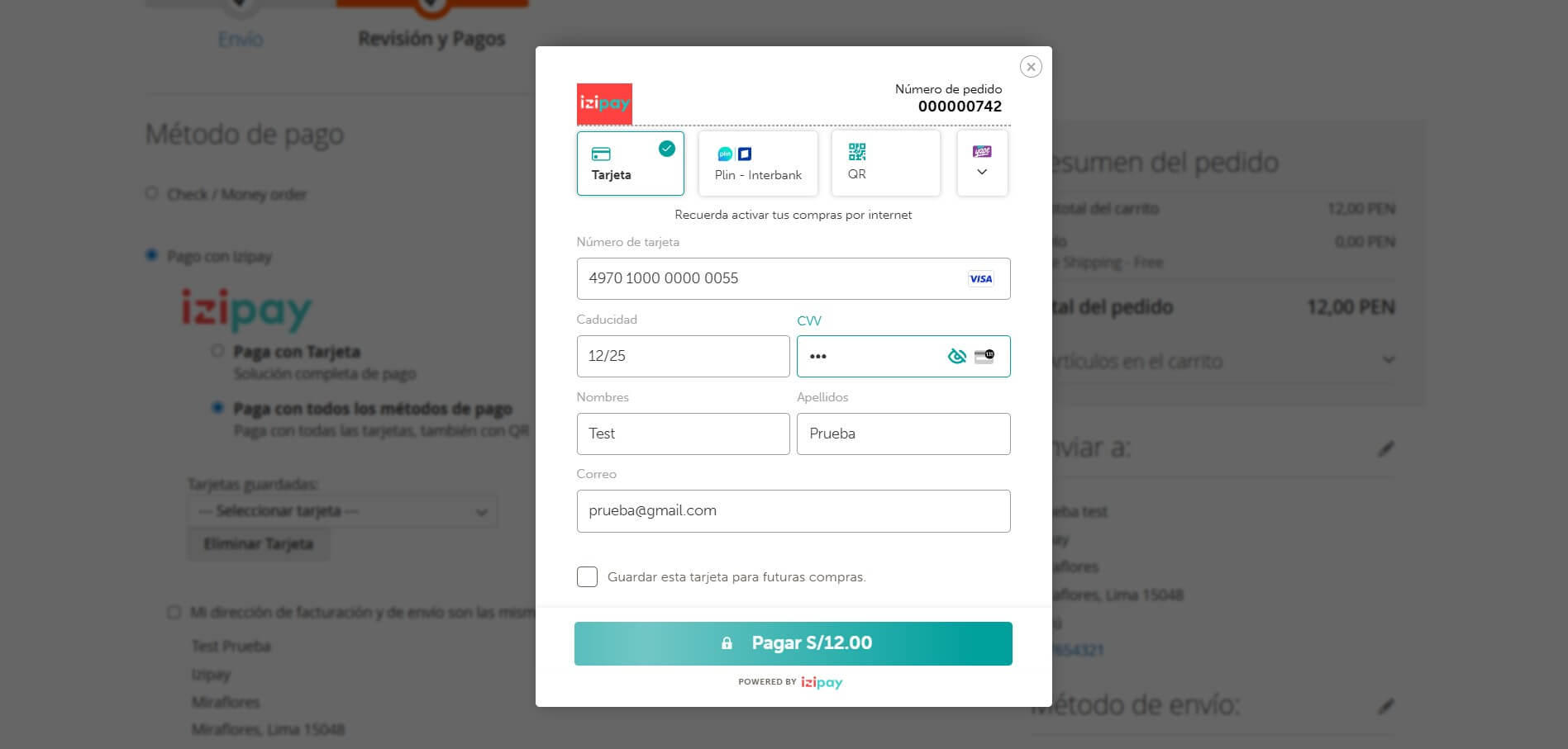 - Completa la compra con una de las tarjetas de prueba brindadas (modo de prueba)