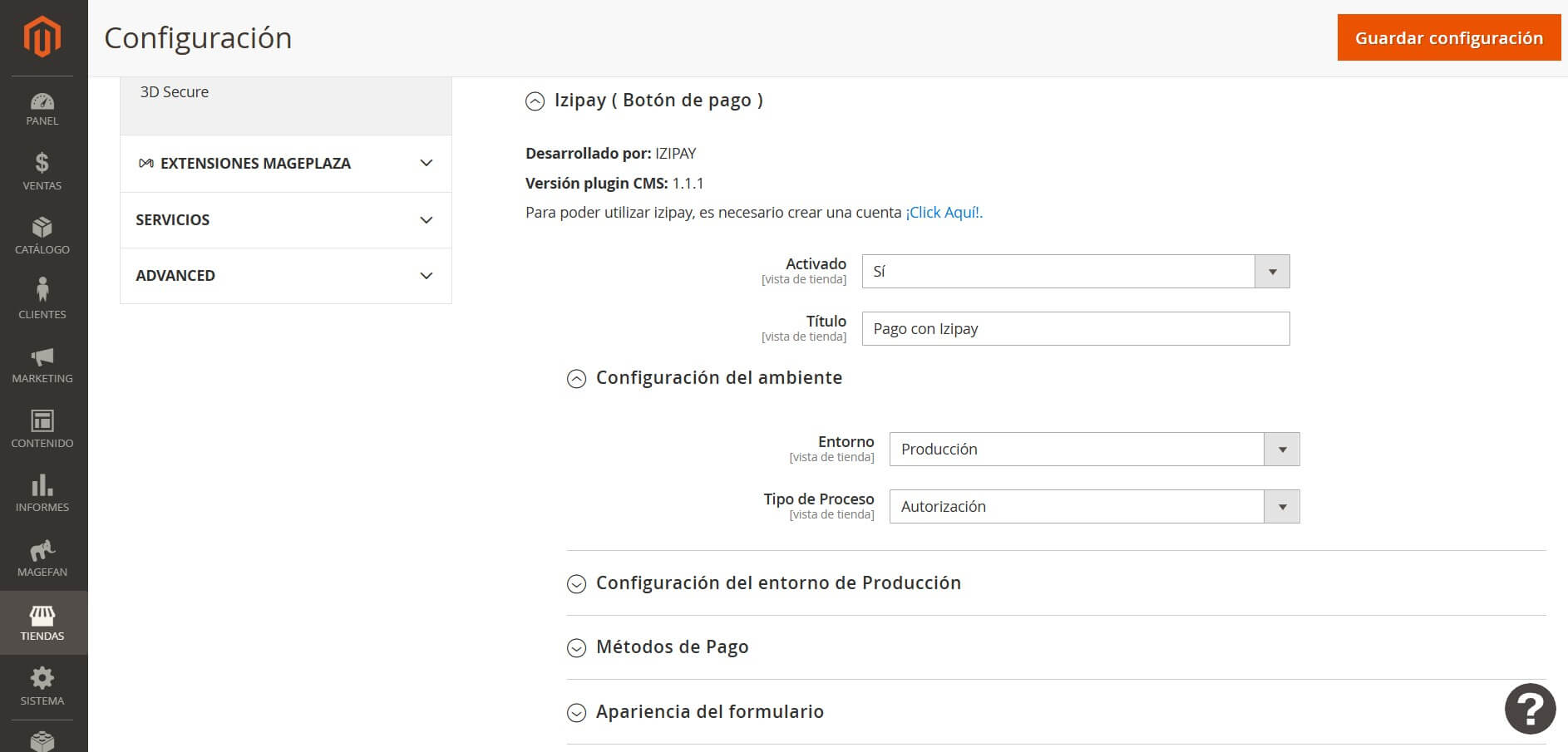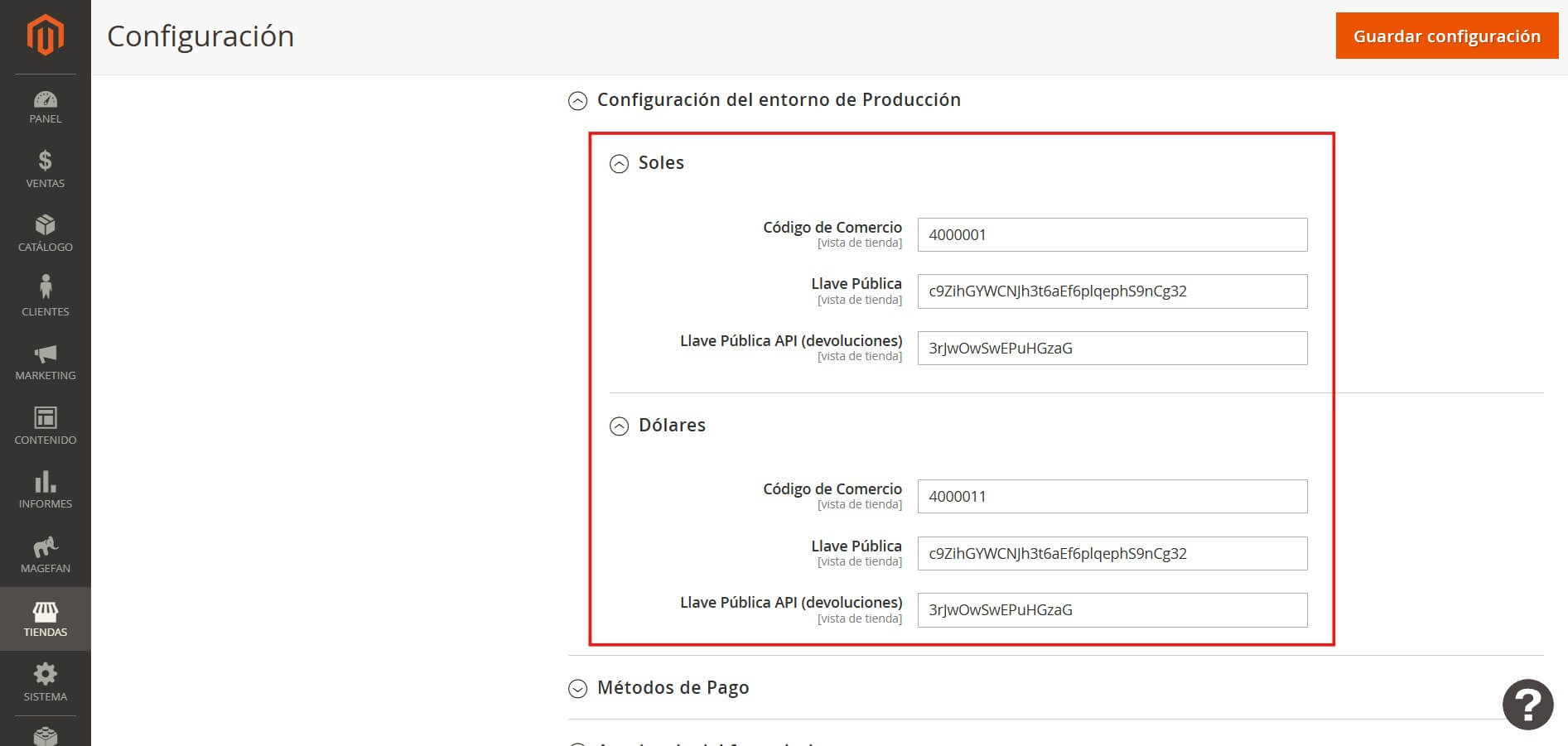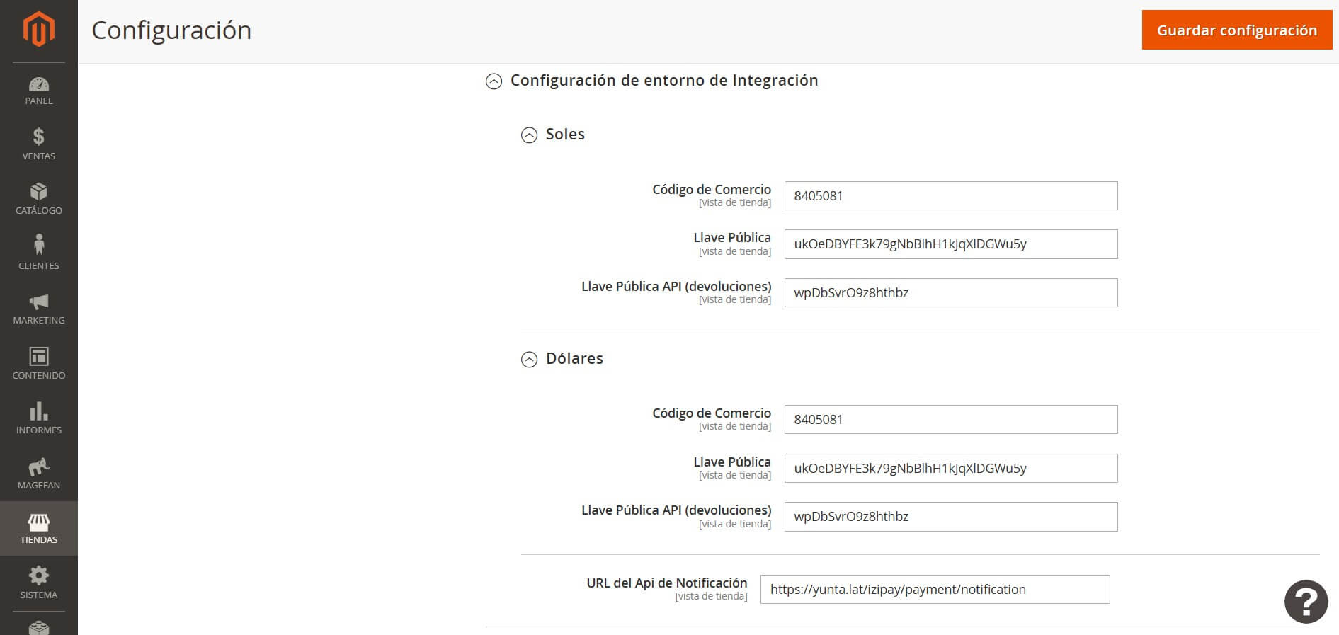- Actualiza los campos “Código de Comercio”, Llave Pública y Llave Pública API (devoluciones) con las credenciales de tu comercio Izipay producción. Luego guarda la configuración.