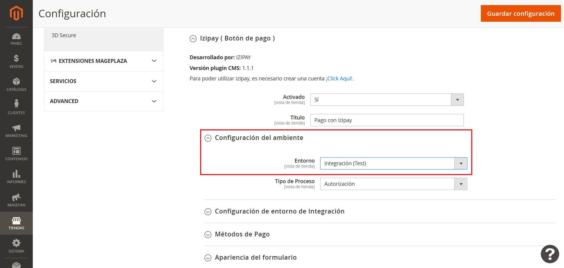 - Cambia en la configuración de entorno "Integración (test)" por "Producción".