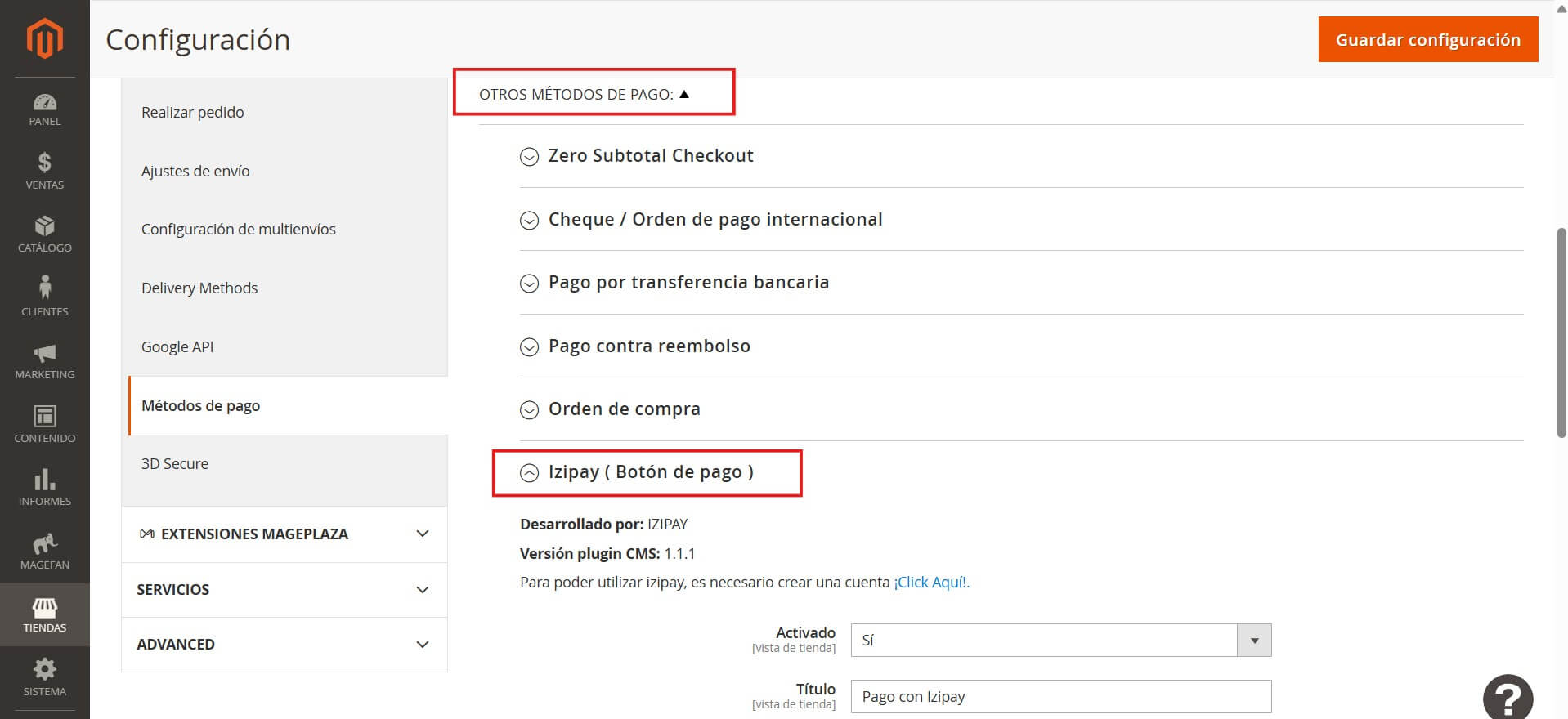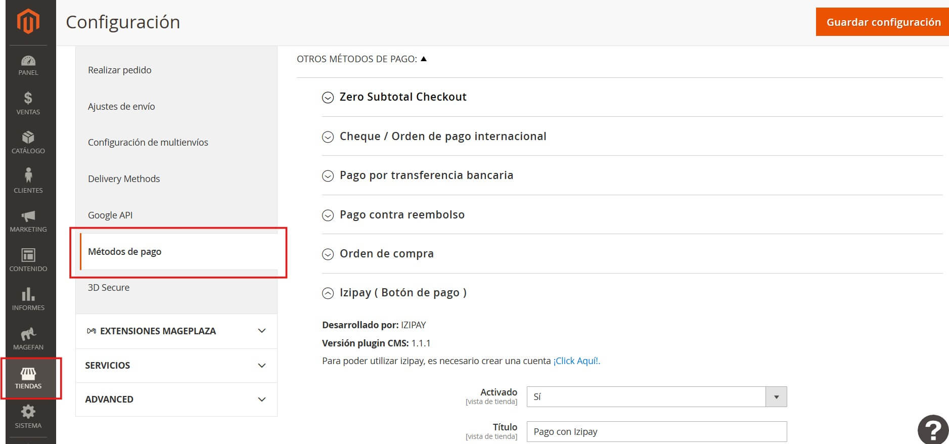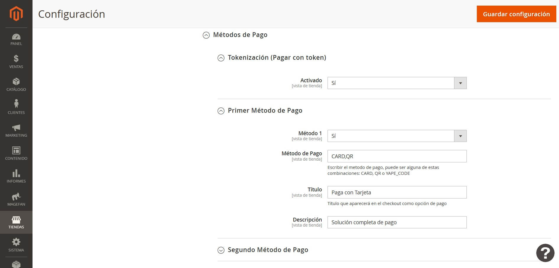 - Ve a Tiendas > Configuración > Ventas > Métodos de Pago