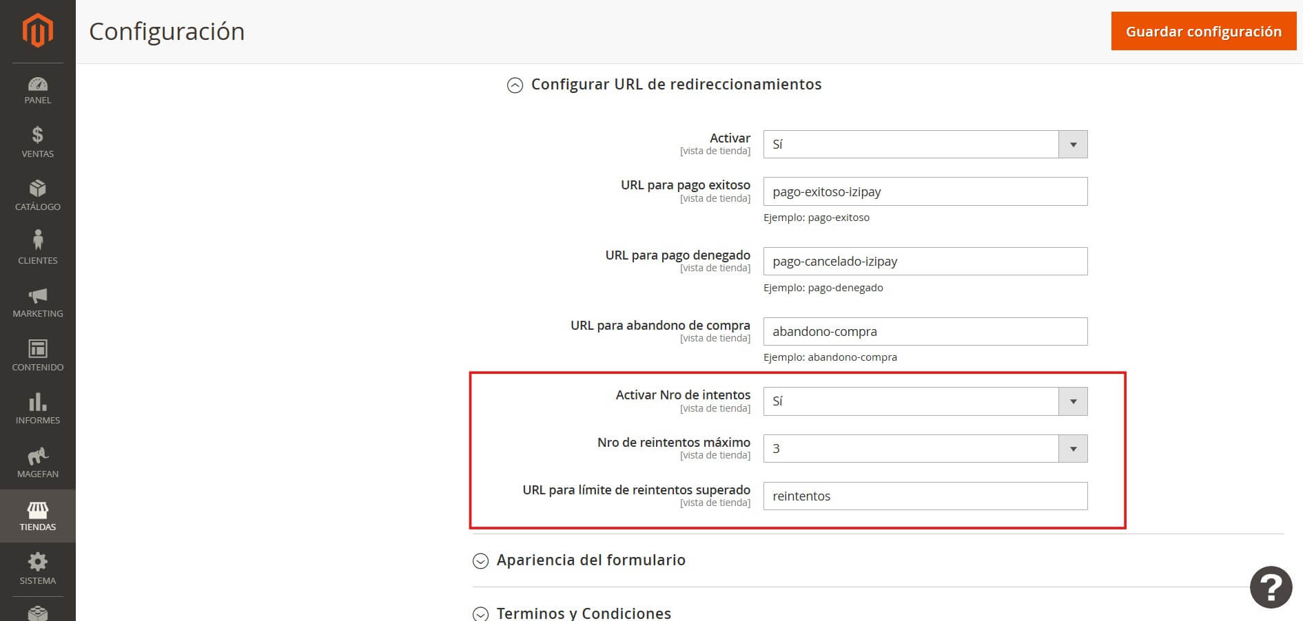 | URL Términos y condiciones | Configura la URLs de redirección para términos y condiciones. |