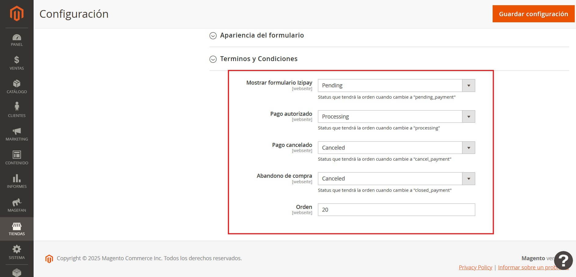 | Configuración de estados | Define los estados automáticos del pedido según las acciones detectadas en el formulario de pago de Izipay, como: mostrar formulario, pago autorizado, cancelado o abandono de compra. |